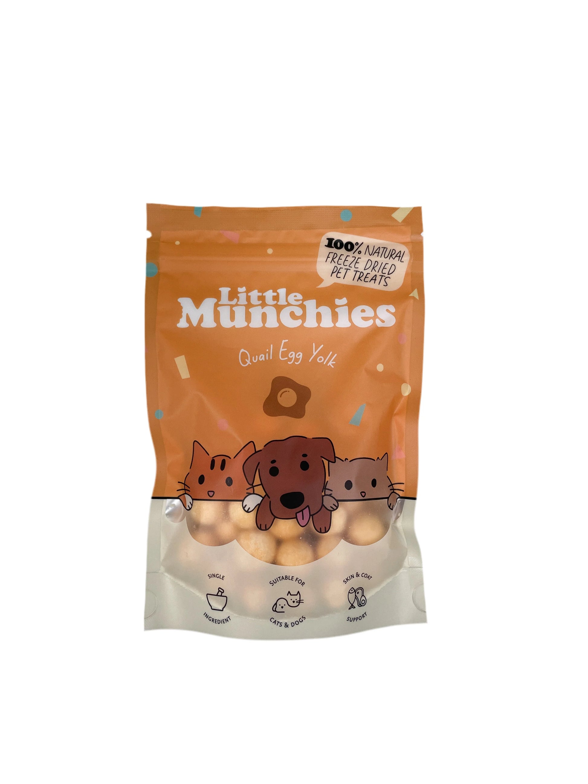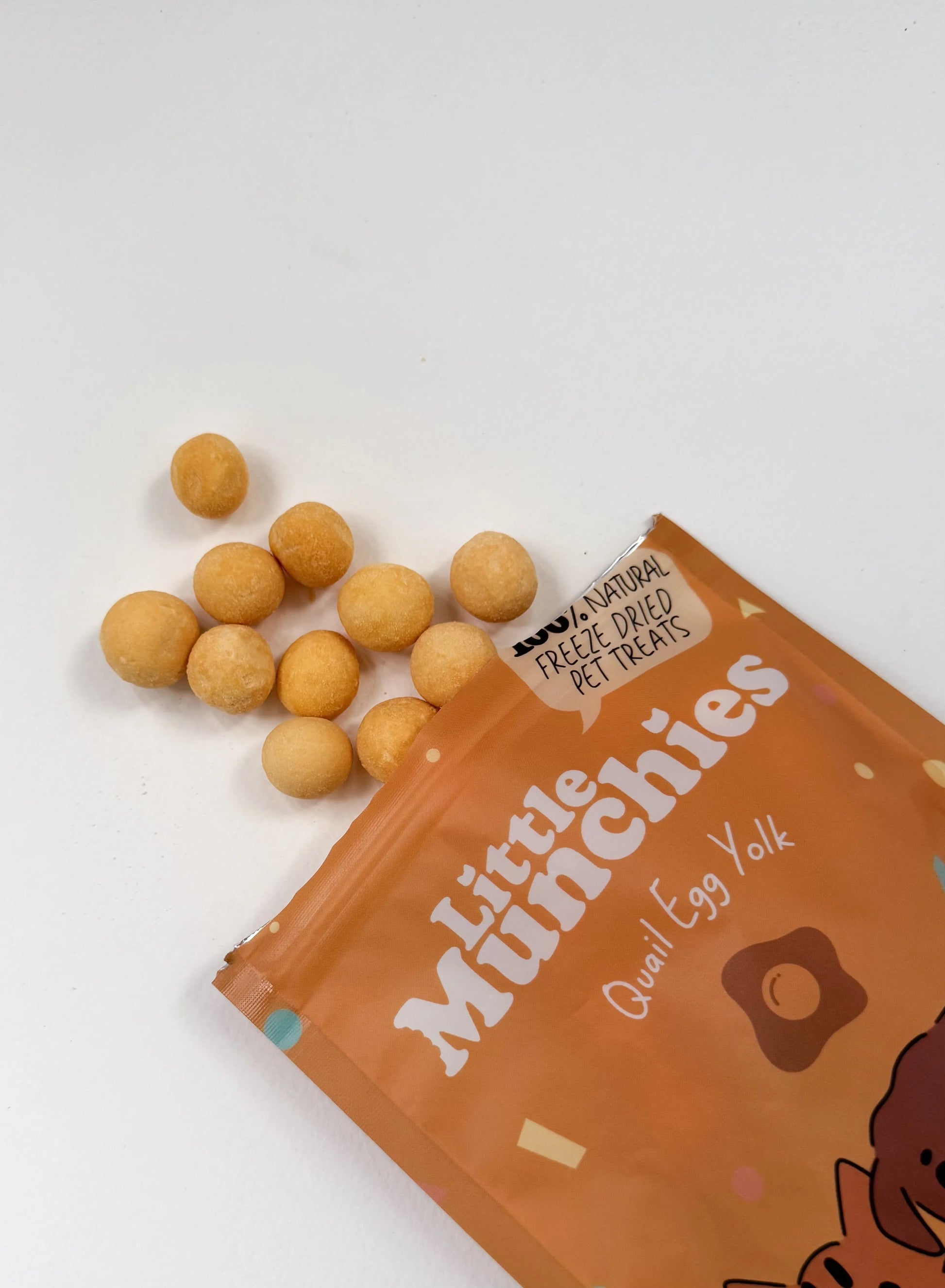 Each bag of treats contain approximately 60g of freeze dried quail egg yolks.