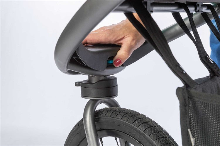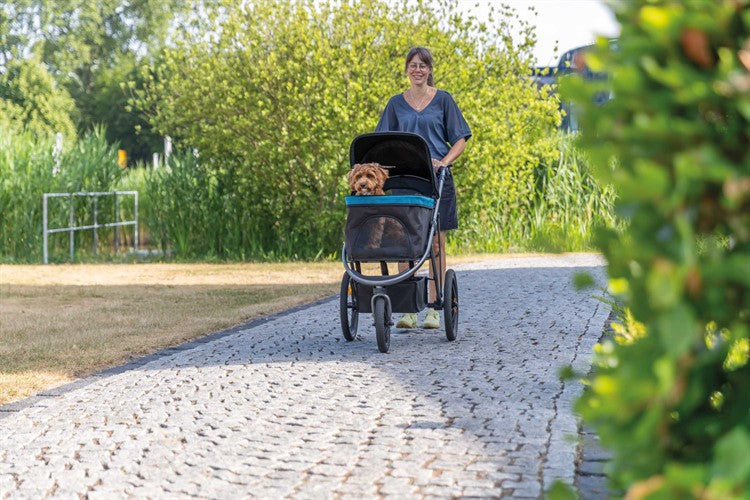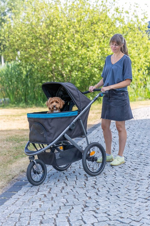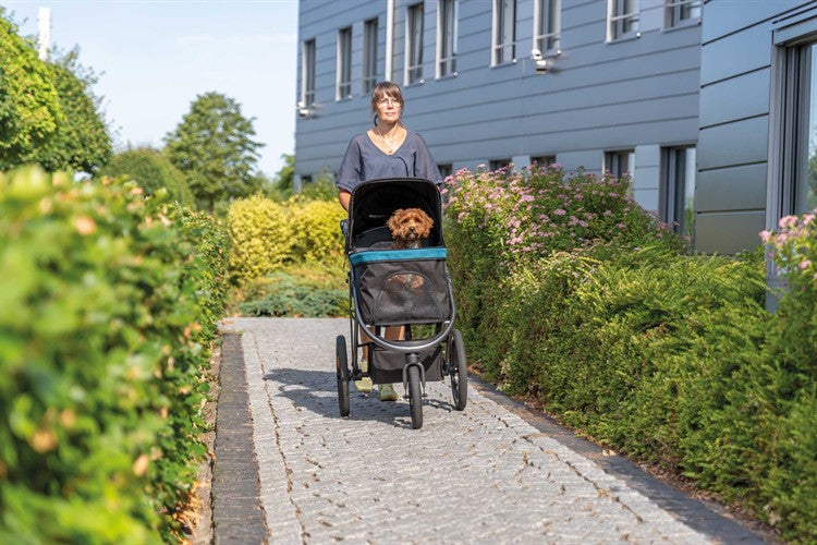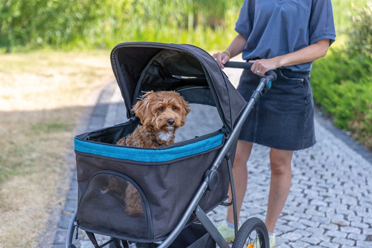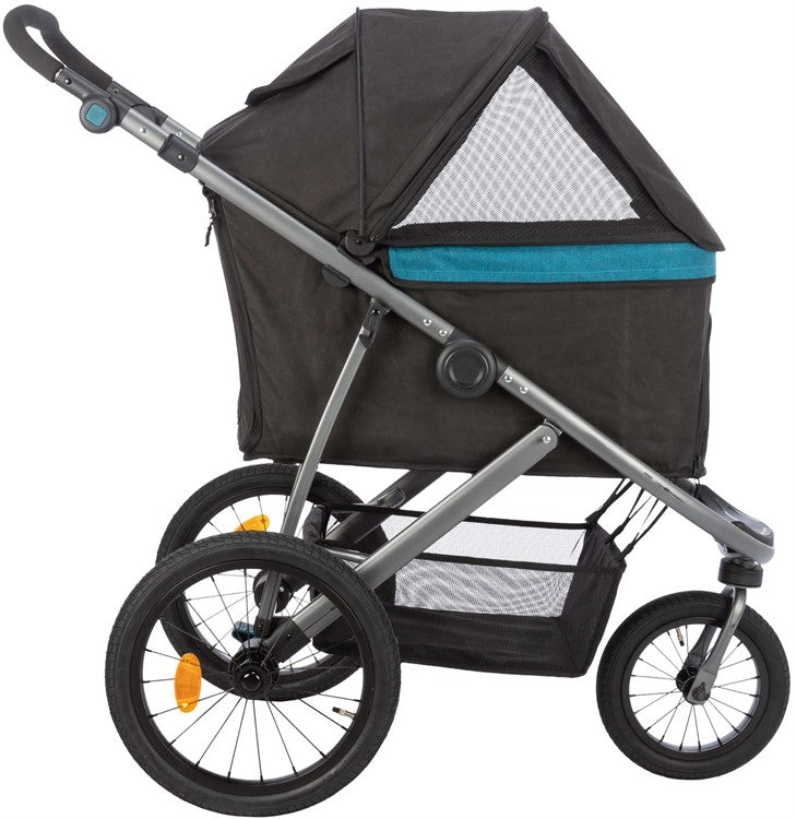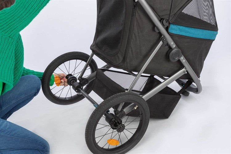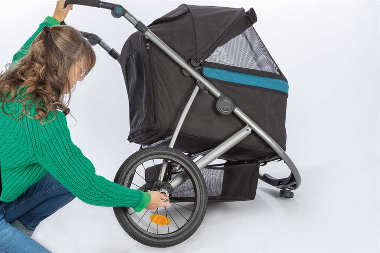 This pet stroller with air-filled tires is the perfect solution for pet owners who want to provide comfort and safety for their older, injured, shy, or very young dogs and cats. Designed with ease of use in mind, this stroller is smooth to maneuver, thanks to its 360° swiveling front wheel, which can also be locked for stability. The air-filled tires ensure a comfortable ride on various terrains, while the parking brake keeps everything secure when stationary.