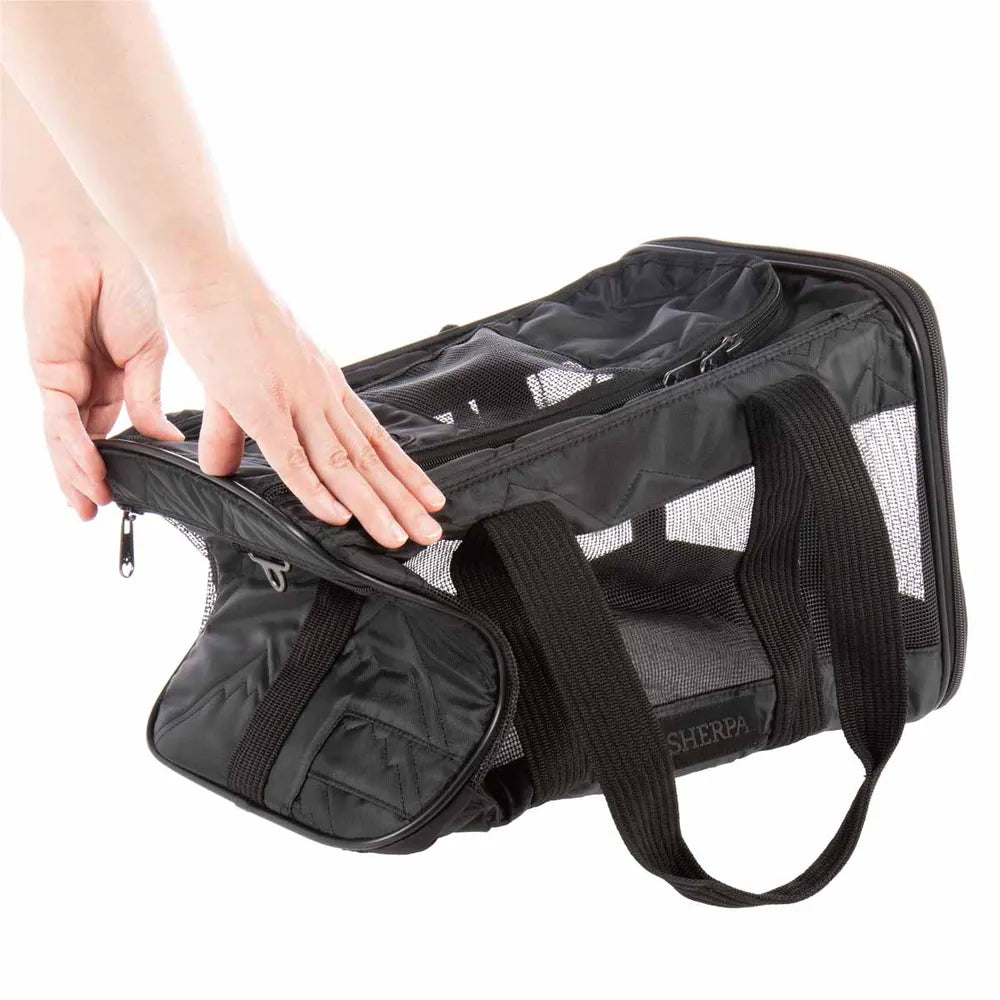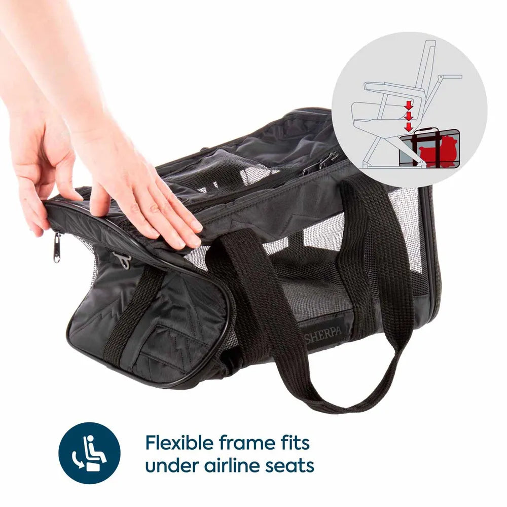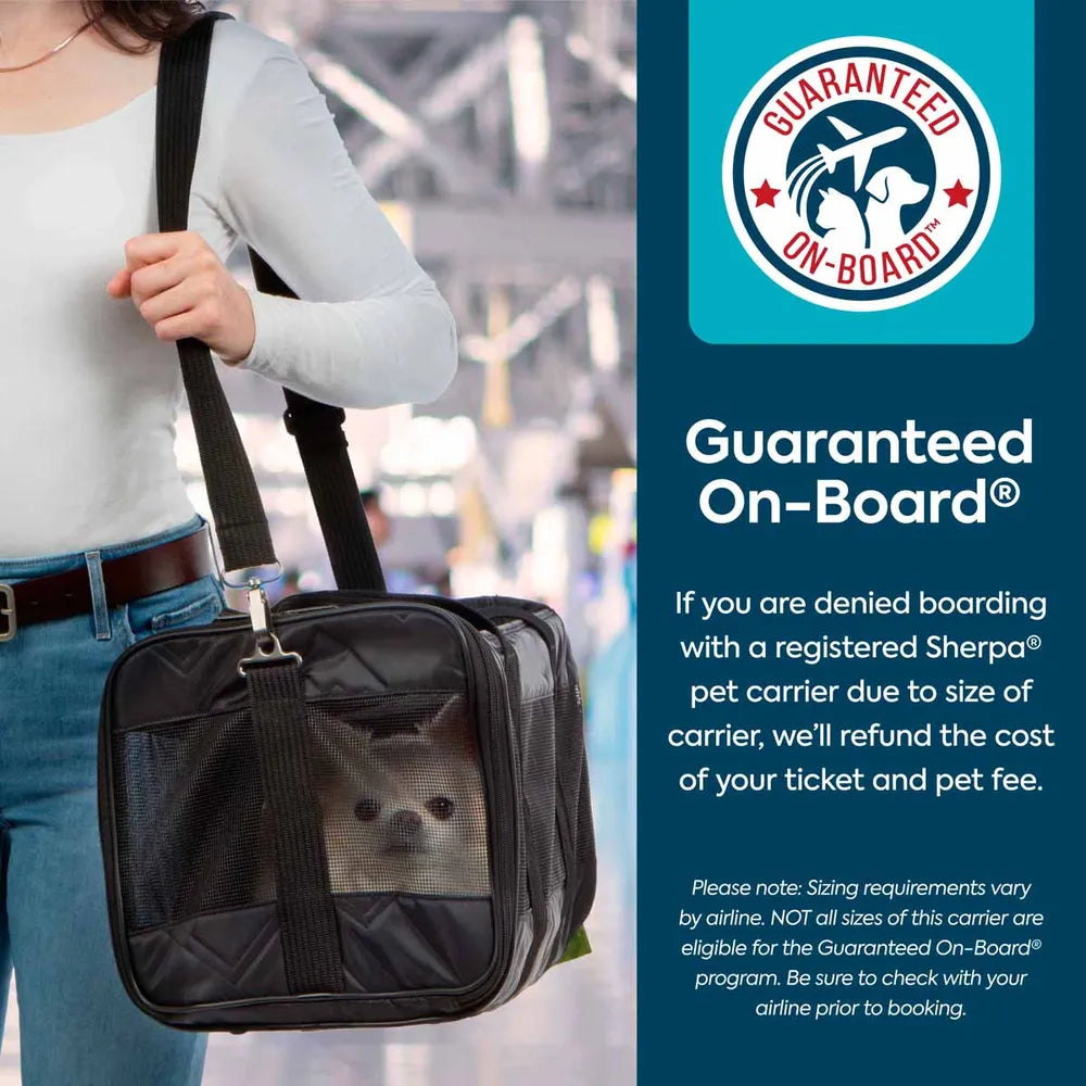 Sherpa Deluxe Pet Carrier är den guldstandarden för transport av husdjur vid flygresor och gör resan säker och enkel. Som en del av vårt Guaranteed On-Board-program guidar vi dig genom kraven från större amerikanska och kanadensiska flygbolag för att garantera att ditt husdjur i sin transportväska inte nekas ombordstigning baserat på väskans storlek. Denna stiliga transportväska med kvalitetsbeslag i gunmetal-finish har topp- och sidoinfarter för snabb och bekväm lastning av husdjuret. Ingångarna har låsbara dragkedjor så att ditt husdjur inte kan klösa eller peta upp dem. Tre nätpaneler säkerställer optimal ventilation och luftflöde. En övre nätpanel ger ditt husdjur möjlighet att se dig medan det är i väskan, vilket hjälper till att lugna och minska resångest. Den mjuka fusk-lammskinnsfodringen runt en stabilitetsbräda vaggar ditt husdjur och ger dem en bekväm bädd som håller formen och inte viker sig under resan. För handsfree-bärning, fäst den justerbara axelremmen eller använd transportväskans bagagehylsa för att säkra väskan på ditt bagagehandtag. Den praktiska fickan med dragkedja och den inbyggda avfallspåsedispensern (avfallspåserulle säljs separat) gör det enkelt att ta med viktiga resehandlingar och tillbehör. Sherpa Air-produkter erbjuder lösningar och säkerhetsfunktioner för att göra dina resor mer avslappnade från avresa till ankomst! Husdjursresor görs enkla med Sherpa Pet Carriers för säkra resor nära och långt borta. Innan du köper din Sherpa-väska, mät ditt husdjur för att hitta rätt storlek och se till att din lilla katt eller hund resekompis passar bekvämt inuti och kan stå upp och vända sig i väskan. Ta alla mått medan ditt husdjur står. För att mäta ditt husdjurs höjd, mät från golvet till toppen av ditt husdjurs rygg; för att mäta ditt husdjurs längd, mät från spetsen av deras nos till slutet av ditt husdjurs bakdel; inkludera inte ditt husdjurs svans i mätningen.