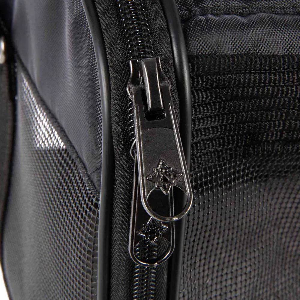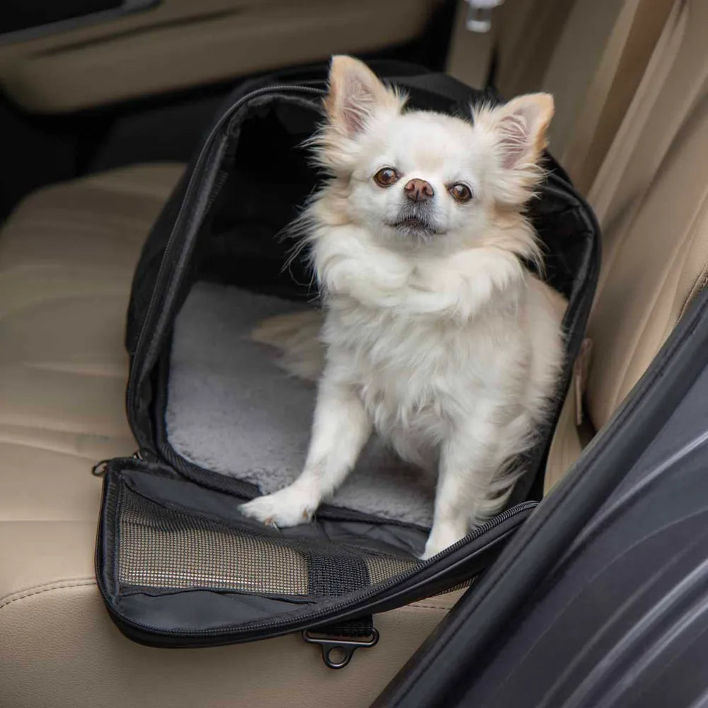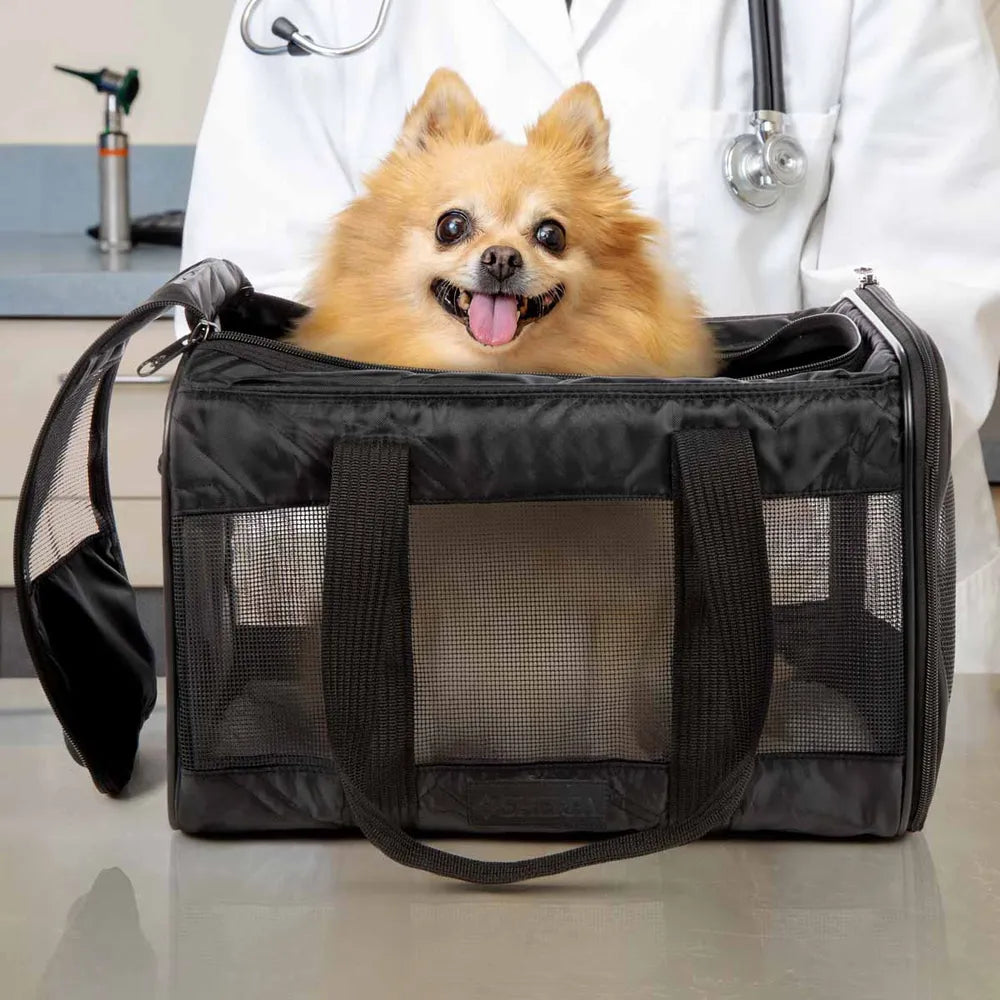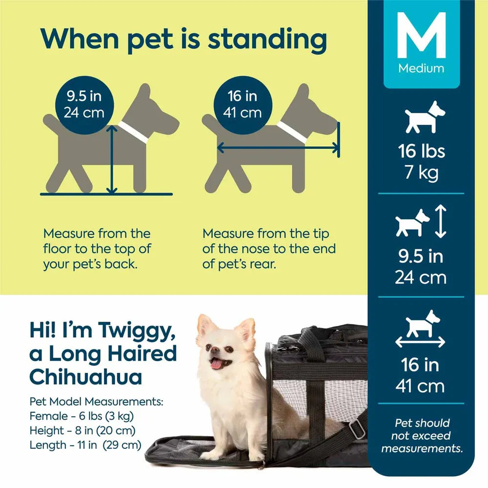 Sherpa Deluxe Pet Carrier är den guldstandarden för transport av husdjur vid flygresor och gör resan säker och enkel. Som en del av vårt Guaranteed On-Board-program guidar vi dig genom kraven från större amerikanska och kanadensiska flygbolag för att garantera att ditt husdjur i sin transportväska inte nekas ombordstigning baserat på väskans storlek. Denna stiliga transportväska med kvalitetsbeslag i gunmetal-finish har topp- och sidoinfarter för snabb och bekväm lastning av husdjuret. Ingångarna har låsbara dragkedjor så att ditt husdjur inte kan klösa eller peta upp dem. Tre nätpaneler säkerställer optimal ventilation och luftflöde. En övre nätpanel ger ditt husdjur möjlighet att se dig medan det är i väskan, vilket hjälper till att lugna och minska resångest. Den mjuka fusk-lammskinnsfodringen runt en stabilitetsbräda vaggar ditt husdjur och ger dem en bekväm bädd som håller formen och inte viker sig under resan. För handsfree-bärning, fäst den justerbara axelremmen eller använd transportväskans bagagehylsa för att säkra väskan på ditt bagagehandtag. Den praktiska fickan med dragkedja och den inbyggda avfallspåsedispensern (avfallspåserulle säljs separat) gör det enkelt att ta med viktiga resehandlingar och tillbehör. Sherpa Air-produkter erbjuder lösningar och säkerhetsfunktioner för att göra dina resor mer avslappnade från avresa till ankomst! Husdjursresor görs enkla med Sherpa Pet Carriers för säkra resor nära och långt borta. Innan du köper din Sherpa-väska, mät ditt husdjur för att hitta rätt storlek och se till att din lilla katt eller hund resekompis passar bekvämt inuti och kan stå upp och vända sig i väskan. Ta alla mått medan ditt husdjur står. För att mäta ditt husdjurs höjd, mät från golvet till toppen av ditt husdjurs rygg; för att mäta ditt husdjurs längd, mät från spetsen av deras nos till slutet av ditt husdjurs bakdel; inkludera inte ditt husdjurs svans i mätningen.